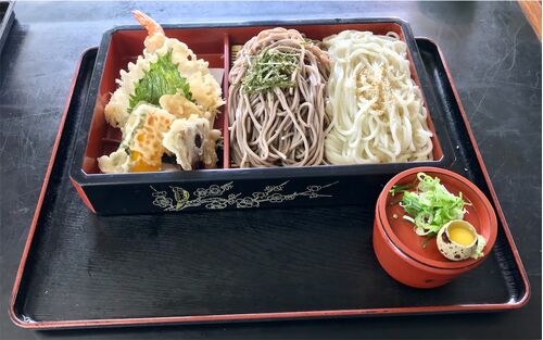 ❇️外食日記、 第442回目は 「はちまん(八幡)うどん」 に行きました。 【注文】 ❇️「天ざる相のり」 を頂きました。 【外観】 【店内】 【メニュー】 【料理】 ❇️天ざる相のり❇️ ⚠️天ぷら盛り合わせ‼️ ⚠️(蕎麦)と(うどん)‼️ ⚠️両方食べれるの、珍しいですよね…