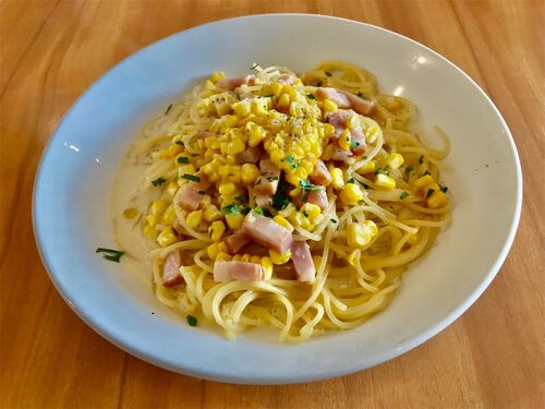 ❇️外食日記、 第1101回目は 「パスタ」を食べたくて 「ラ フォルトゥーナ (La Fortuna)」 に行きました。 【注文】 ❇️「スイートコーンと ベーコンのクリームパスタ +バスク風チーズケーキ」 を頂きました。 【外観】 【店内】 【メニュー】 【料理】 ❇️ス…